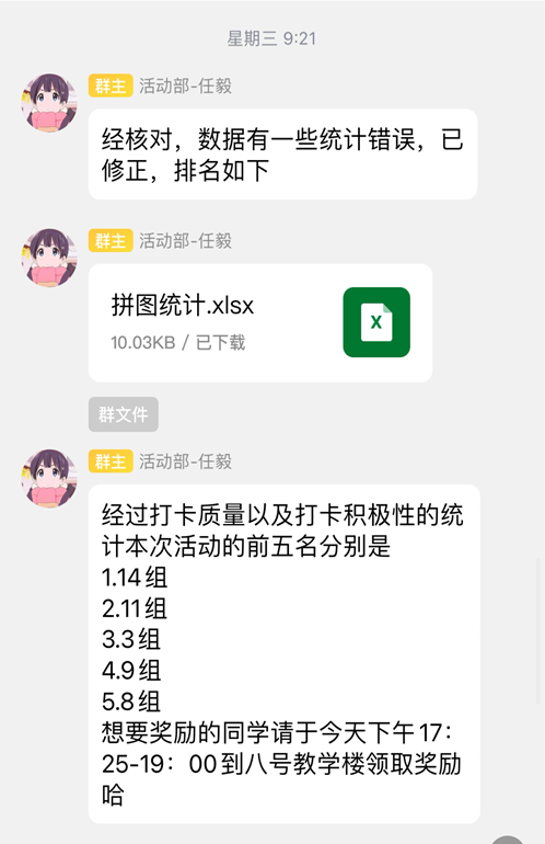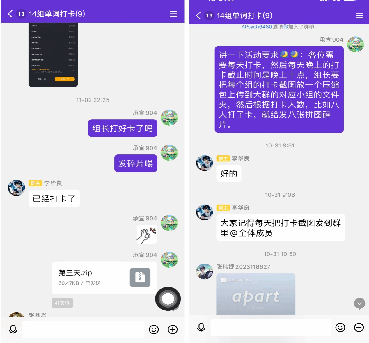 活动中期开展,活动组权益组的同学认真负责、恪尽职守,轮流确认报名同学的每日打卡情况,并及时统计信息,确认每一组成员的打卡推进情况。在参与活动期间,同学们展现出严谨的学习态度,不断努力,积极向上,营造了浓厚的学习氛围。同时,同学们也注重团结互助,共同营造朝气蓬勃、困知勉行的校园风气。负责人认真统计按时发放拼图,各组组长积极督促组员背诵,组员们也按时打卡,在参与活动的同时掌握更多英语词汇,为四、六级考试打下坚实的单词基础。